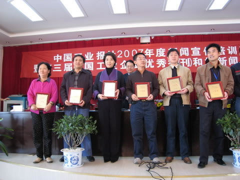 本報訊 日前,在云南省大理市召開的中國工業(yè)報社2007年度新聞宣傳培訓(xùn)班暨第三屆中國工業(yè)企業(yè)優(yōu)秀報刊和好新聞領(lǐng)獎大會上,我《杭機(jī)集團(tuán)報》被評為中國工業(yè)企業(yè)2007年度優(yōu)秀報刊一等獎,其獲獎?wù)Z是:欄目豐富、形式活潑、文章短小精悍,并出版中德雙語報,便于外籍專家了解企業(yè)動態(tài)。本報記者陳烈新采寫的《首席工程師加冕儀式在中科院杭州科技園舉行》報道,榮獲好新聞(消息)評選二等獎,這反映了我集團(tuán)重視人才隊伍建設(shè)引起了媒體的關(guān)注和肯定。集團(tuán)公司黨委書記董事長朱金根獲悉,當(dāng)即給出席頒獎會的主編王忠民發(fā)賀訊:“祝賀你,并與你們共享榮譽(yù)和喜悅!”