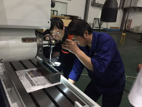圖為專家在杭機股份現(xiàn)場抽查M7132H臥軸矩臺平面磨床的幾何精度